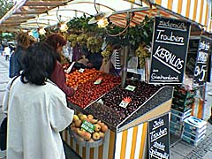 Customers line up to buy fruit from an outdoor stand on Neuhauser Strasse.