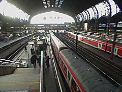 | We wanted to get from Berlin to Copenhagen in one day, but that meant either leaving before 7am or getting there late in the evening. We'd have to change trains in Hamburg, a place we'd planned on making a "whistle stop" anyway. We left Berlin late Thursday morning in order to reach Hamburg before the afternoon rush hour. After spending a night there, we'd catch a morning train for Copenhagen. Even though we were on a non-smoking car, this turned out to be one of the most hellish train rides we'd ever taken. Our seats were in the end of the car closest to the smoking car, and only a single sliding door separated us from the toxic cloud on the other side. Every time someone passed through that door, cigarette smoke would come billowing into the non-smoking car. Getting off that train felt like coming up from under water. Hamburg Hauptbahnhof (main station) is not a pleasant place at 3 in the afternoon. It suffers from the same commercialization and lack of navigational aids that we'd found in Berlin, but this station was much more crowded and hysterical. It seemed as if tens of thousands of people were there at any given time. Not even Union Station in Chicago was this crazy. It took a while to find the tourist information office, which was hard to see in the forest of big and bright storefronts of junk food purveyors. We asked for a low-priced room close to the bahnhof, and got one a block away for 100 marks (less than $50). Once we got away from our unusually chatty desk clerk, we relieved ourselves of our rucksacks and set out for our main destination in Hamburg: the Kaiser Keller. Kaiser Keller is a club on a strip called the Reeperbahn. In the early 60's the Beatles played there almost nightly. Long before most people had ever heard of the Beatles they were the opening act for some other guy who's been long since forgotten. Our map was adequate to show us how to get there on the S-bahn, but many factors conspired to keep this from being a pleasant trip. When we got to the platform and looked for the ticket machine (which was conveniently located on the platform in Berlin), we were told we'd have to go back up to the street to find one. It was rush hour, everyplace was crowded, and in about 15 minutes darkness would make photography impossible. We were already in extremely foul moods from having spent over three hours in a cloud of tobacco smoke. We got our tickets and waited for our train. Another train came, one that shares the same platform and much of the route of ours. Looking at our map, it looked like this train would work. It didn't. We had to get off, take another train back to our line, and change again. It cost us about 20 minutes, which doesn't sound like much unless you're a photographer racing against the setting sun. We got there and found the Reeperbahn to be a very sleazy neighborhood, mostly filled with assorted strip clubs, with an occasional disco or live music venue mixed in. At Kaiser Keller we saw a small display behind a window acknowledging that location's significance in musical history. Darkness had rendered digital photography impossible, so we had to use the flash to commit images to film, which won't be processed until we get home. We had dinner close to our hotel at a place best described as a trendy cafe. The owner of a nearby health food store sent us there when we'd asked where we could eat without breathing smoke. He had to think hard before sending us there. The cafe was in part of the ground floor of a larger building, and the smoke-free seating was out in the poorly-heated lobby. We ate a fairly decent meal with our coats on while a young couple groped each other very publicly on the other side of the window. No one bothered to tell them to "get a room."