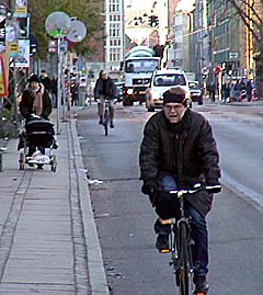 ![]() Most major streets in Copenhagen have bicycle lanes that are well segregated from pedestrian traffic on one side and motorized traffic on the other.