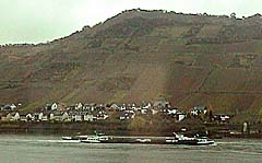 ![]() Through the reflections in our train window we could see this barge making its way down the Rhine. A small German town is on the riverside, and vineyards lie on the hillsides like quiltwork.