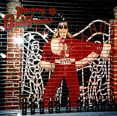 A dancing Elvis manequin upstages a nativity scene as the store display beckons, "Merry Quiffmas."
