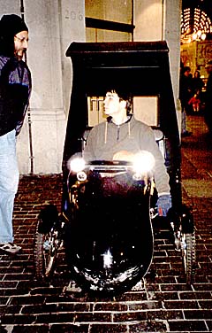 ![]() Obbie questions the operator of a London pedicab on the vehicle's modern recumbant design.